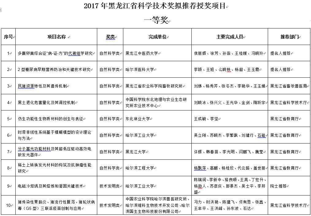 2017年黑龙江省科学技术奖专业组网评工作已经结束,现将拟推荐授奖项目和等级进行公告(每个奖等项目顺序按第一完成人姓氏拼音字母排序)。如对公告项目的内容、完成单位及人员名次等有异议,请在公告之日起一个月内,以书面形式(不受理匿名异议)报送黑龙江省科学技术厅成果管理与推广处(哈尔滨市南岗区中山路202号,邮编:150001),逾期恕不受理。被推荐授奖的项目允许在异议期内申请撤奖,异议期后,省科学技术奖励委员会将召开评审会议对公告项目进行答辩评审和审定。本公告不作为已授奖的依据。公告推荐的授奖项目和等级详见黑龙江省科技厅网站首页通知通告栏(http://www.hljkjt.gov.cn/)。