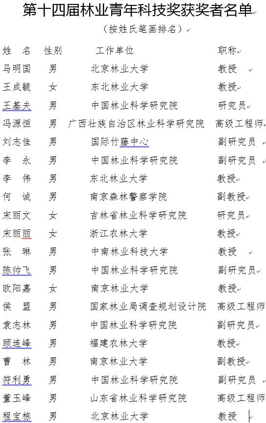 根据《林业青年科技奖条例》有关规定,经请示国家林业局领导同意,并报国家公务员局考核奖励司备案,国家林业局人事司和中国林学会联合组织开展了第十四届林业青年科技奖的评选工作。经各推荐单位初评、林业青年科技奖奖励工作办公室形式审查、专家评审委员会评审等程序,初步评选出北京林业大学马明国等20名同志为第十四届林业青年科技奖获得者(名单见附件)。