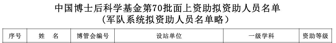 根据《中国博士后科学基金资助规定》,现对中国博士后科学基金第70批面上资助拟资助人员名单予以公示,军队系统拟资助人员名单由军队系统另行公示。公示期为11月8日至11月14日。