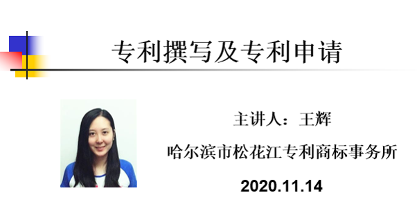 优秀毕业生王辉应高分子材料与工程专业负责人邸明伟教授的邀请,于2020年11月14日(周六)上午10:00-11:00,通过腾讯会议在线为生物材料工程学科方向的博士、硕士研究生以及高分子材料与工程专业的本科生进行了一场有关专利撰写及申请的知识讲座。