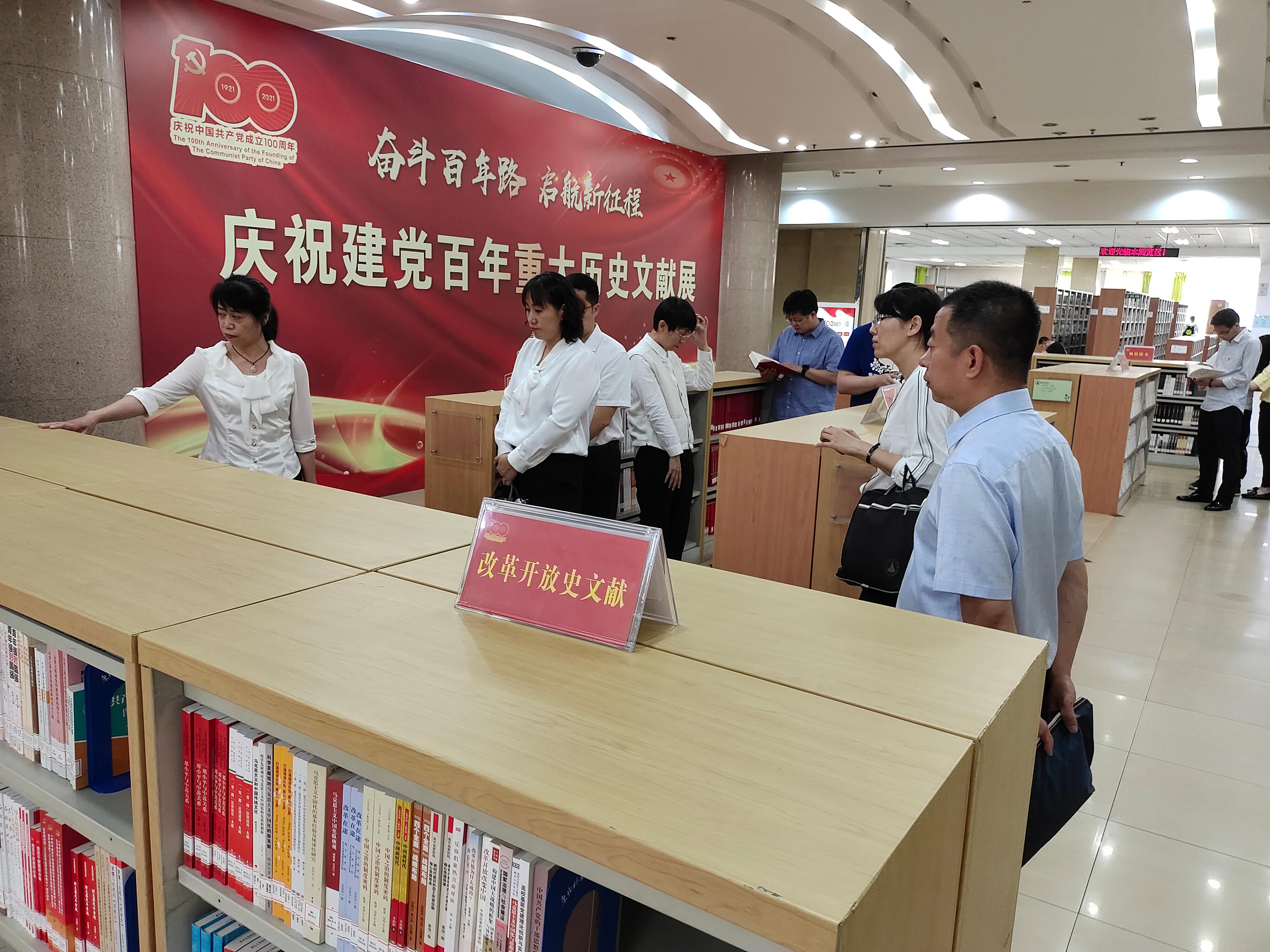 1、参观“奋斗百年路 启航新征程”庆祝建党百年重大历史文献展。由葛玉香老师对本次图书展进行介绍,现场演示博看电子阅报机、歌德电子书借阅机的使用。