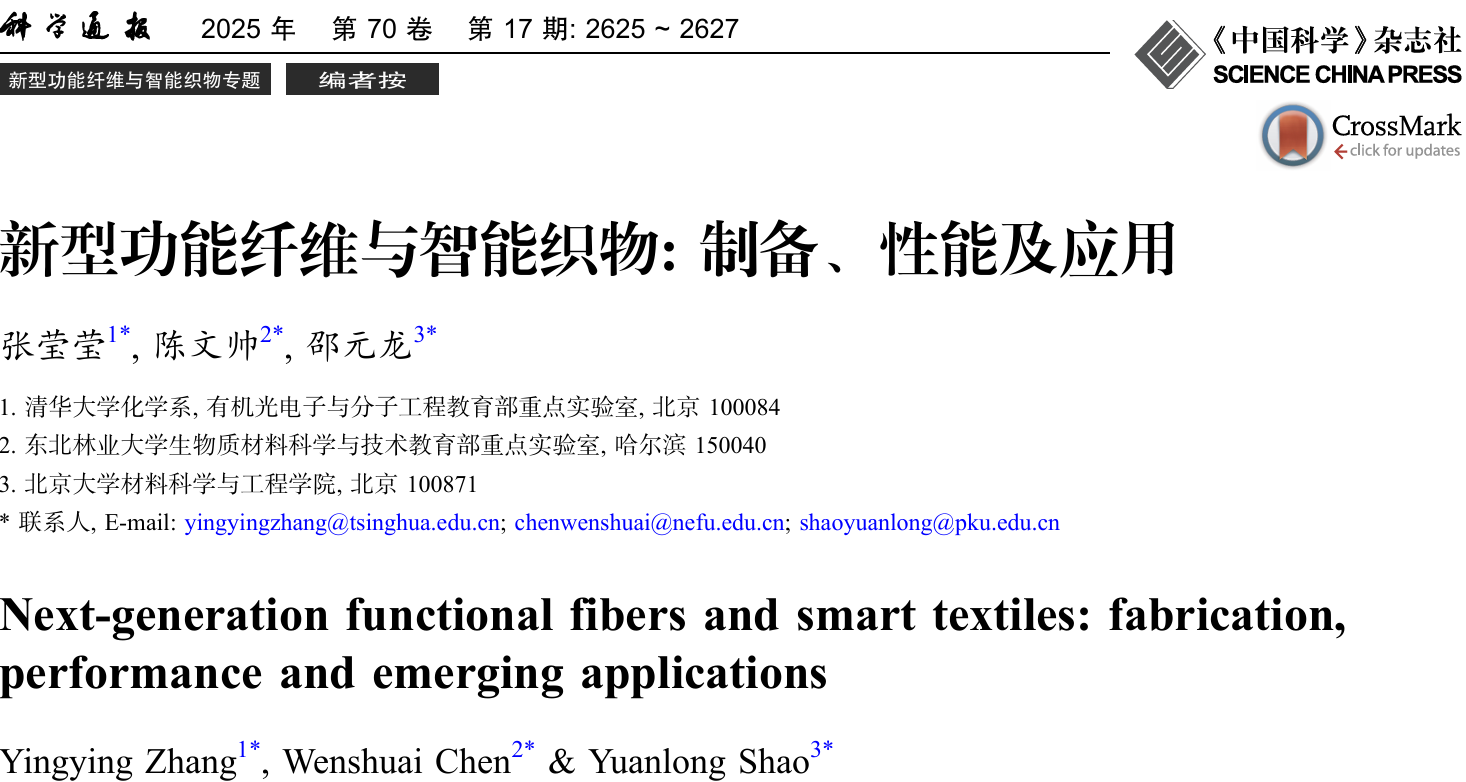 We are delighted to share that a special issue titled “Next-generation functional fibers and smart textiles: fabrication, performance and emerging applications” has been officially published in Chinese Science Bulletin. This special issue is co-guest-edited by Prof. Chen, in collaboration with Prof. Yingying Zhang from Tsinghua University and Prof. Yuanlong Shao from Peking University. It brings together the latest research progress from some of Chinese top-scientists in the field of functional fibers and smart textiles. The webpage for the special issue is https://www.sciengine.com/CSB/issue/70/17