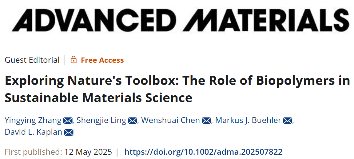We are delighted to share that a special issue titled “Exploring Nature's Toolbox: The Role of Biopolymers in Sustainable Materials Science” has been officially published in Advanced Materials. This special issue is co-guest-edited by Prof. Chen, in collaboration with Prof. Yingying Zhang from Tsinghua University, Prof. Shengjie Ling from Fudan University, Prof. Markus J. Buehler from MIT, and Prof. David L. Kaplan from Tufts University. It brings together the latest research progress from some of the world's top scientists in the field of biopolymers. We hope that readers will find the content of this special issue on biopolymers both enlightening and inspiring, as it delves into the vast potential of nature's toolbox. The webpage for the special issue is https://advanced.onlinelibrary.wiley.com/toc/15214095/2025/37/22
