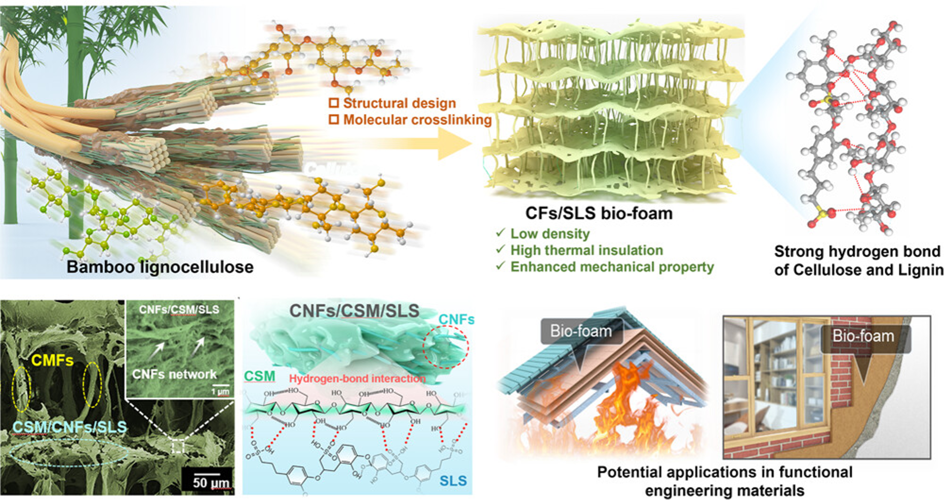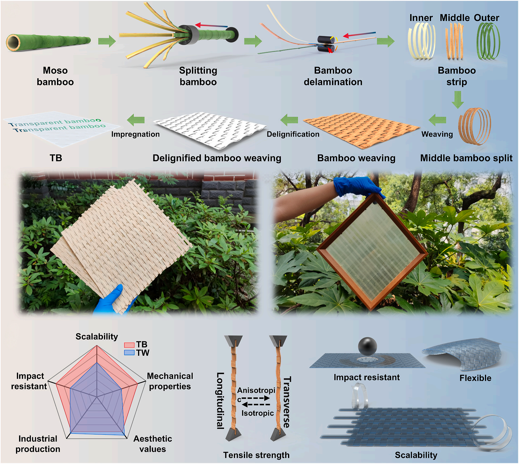 Large-scale fabrication of transparent bamboo structural materials with turnable mechanical strength.