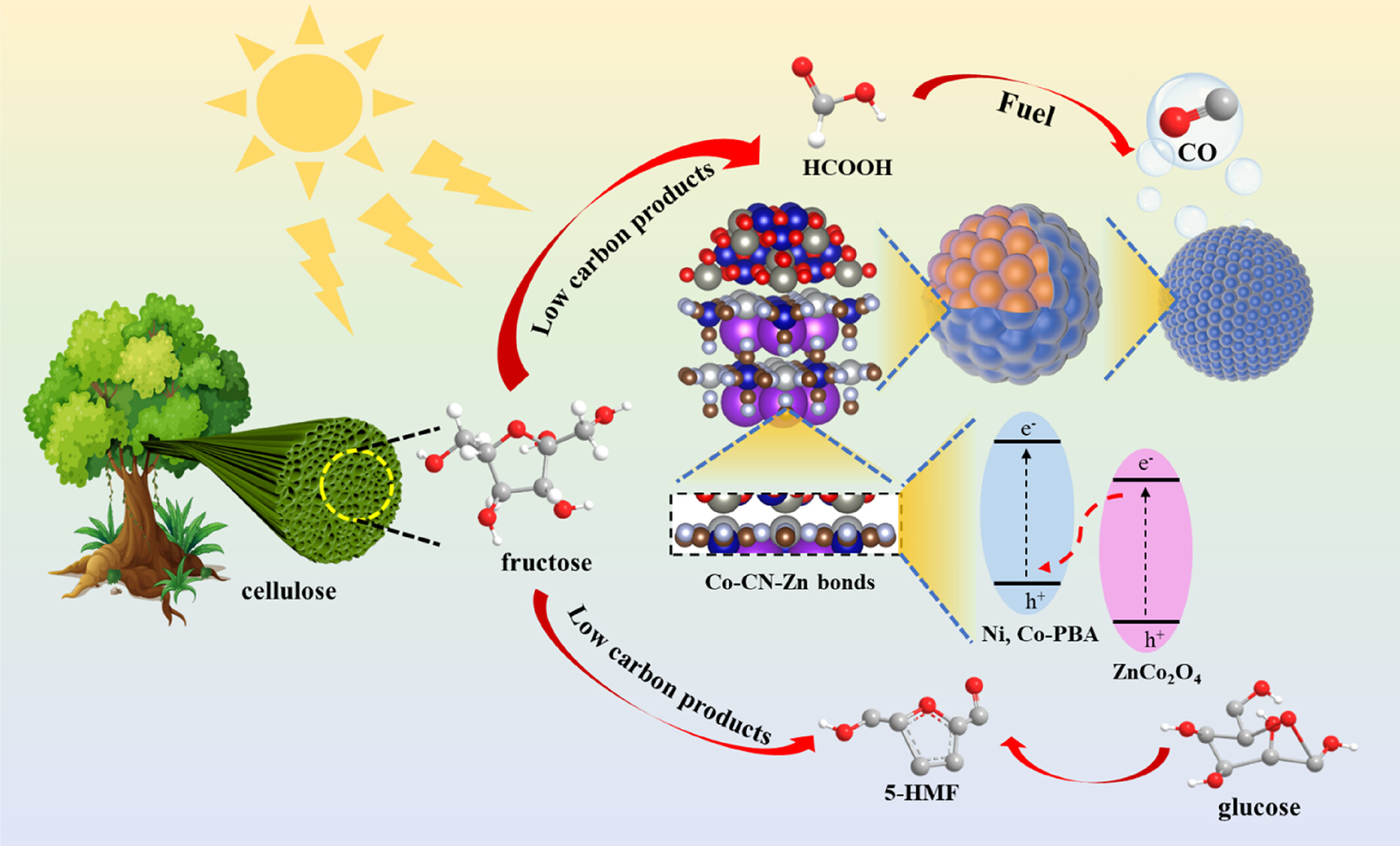 Prussian blue analogs photocatalyst promote the evolution of value-added platform compounds via Co-CN-Zn covalent bonds.