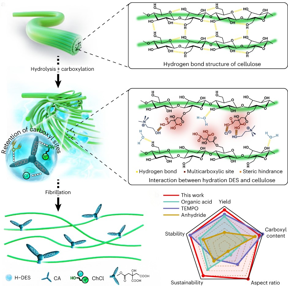 Scalable production of carboxylated cellulose nanofibres using a green and recyclable solvent.