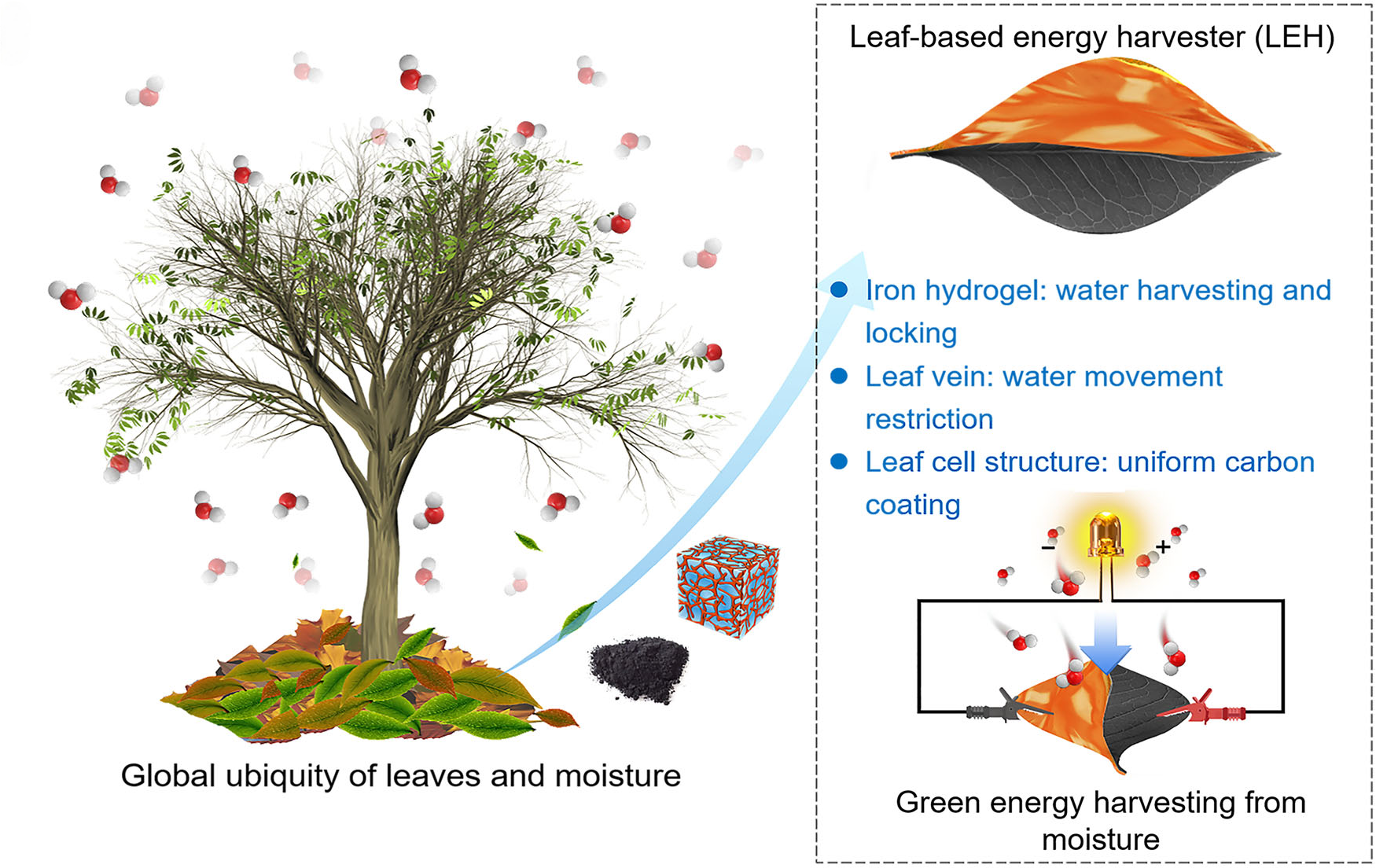 Leaf-based energy harvesting and storage utilizing hygroscopic iron hydrogel for continuous power generation.