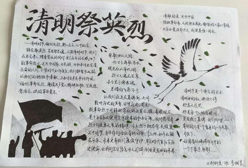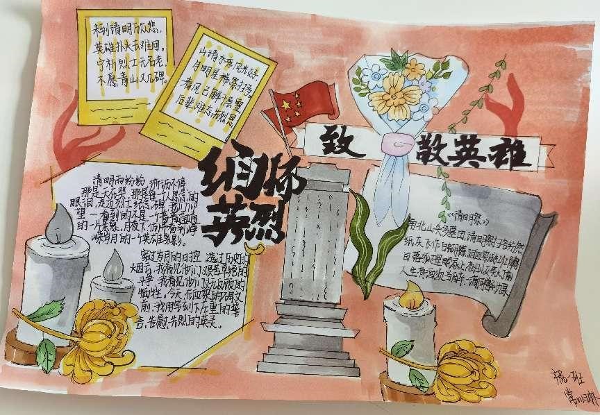 在活动中,同学们充分利用互联网学习了革命先烈和抗疫英雄们的英勇事迹,并用手中的画笔在纸上绘制出英雄们在中华民族生死存亡的关键时刻顽强奋斗的故事。同学们以自己的方式走近革命先烈,走近无名英雄,把真诚的祝福送给如今依旧在抗疫前线的“逆行者”们。在绘制手抄报的过程中,同学们深刻地体会到:在艰苦卓绝的革命战争年代,革命英烈们对中华民族伟大复兴的执着追求,以及为此而舍身忘我的英勇献身精神。这些精神始终是激励我们奋勇前进的强大动力。疫情当下,我们更应该以身作则、众志成城,同防疫一线的工作者们一同打赢这场没有硝烟的战“疫”。