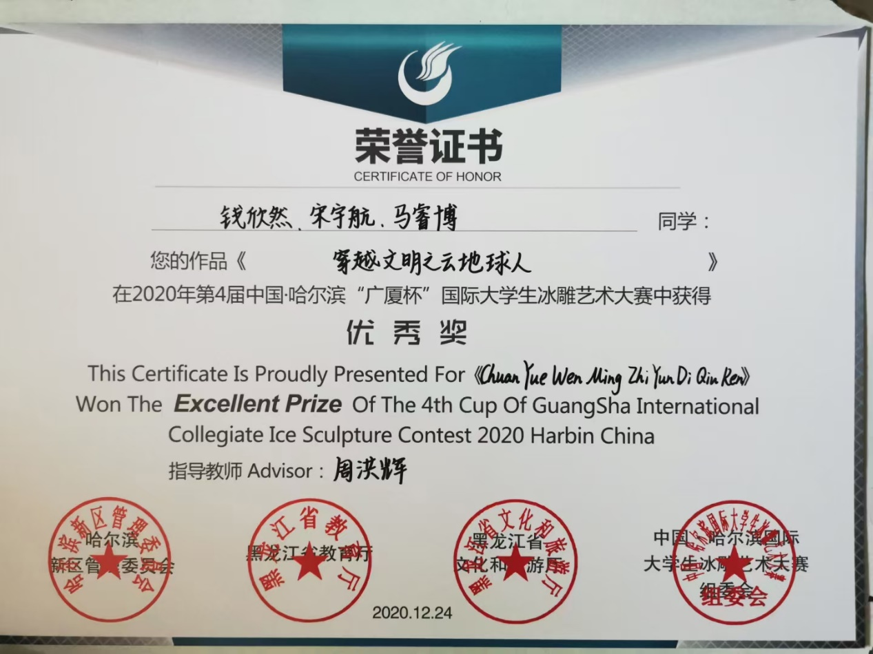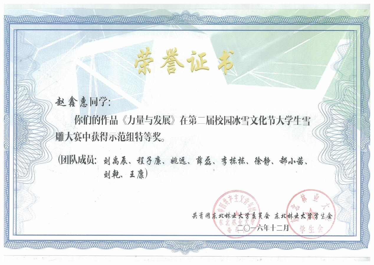 设计思路来到位于冰城哈尔滨的“东北林业大学”,这里是雪雕艺术最发达的地区。“挑战杯”面向全国各地的大学生朋友,我们将以雪为纸,以刀为笔,向各地的大学生朋友们展示我东林人的承办热情和独特风采。创作感想为了迎接“挑战杯”,为了迎接来自祖国各地的青年朋友,我们不惧严寒、不辞辛苦,队员们协力配合打磨作品,一切的努力都是值得的。当看到我们的作品被很多人拍照留念的时候心里很美。