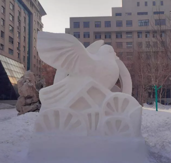设计思路雪雕以和平鸽为主体,以世界和平标志为背景。汹涌的波涛暗示和平鸽不畏艰险冲破障碍、终将抵达和平的彼岸。增添东林校徽,寓意东林人将同和平鸽一样,为祖国奉献力量。创作感想我们自初稿起就开始反复修改,最后定下了青春之鸽。在高飞老师的指导下,我们迈出了雕刻的第一步,尽管我们雕刻技术尚显生涩,但是我们相信,在不懈努力下终会完成出令人满意的作品。