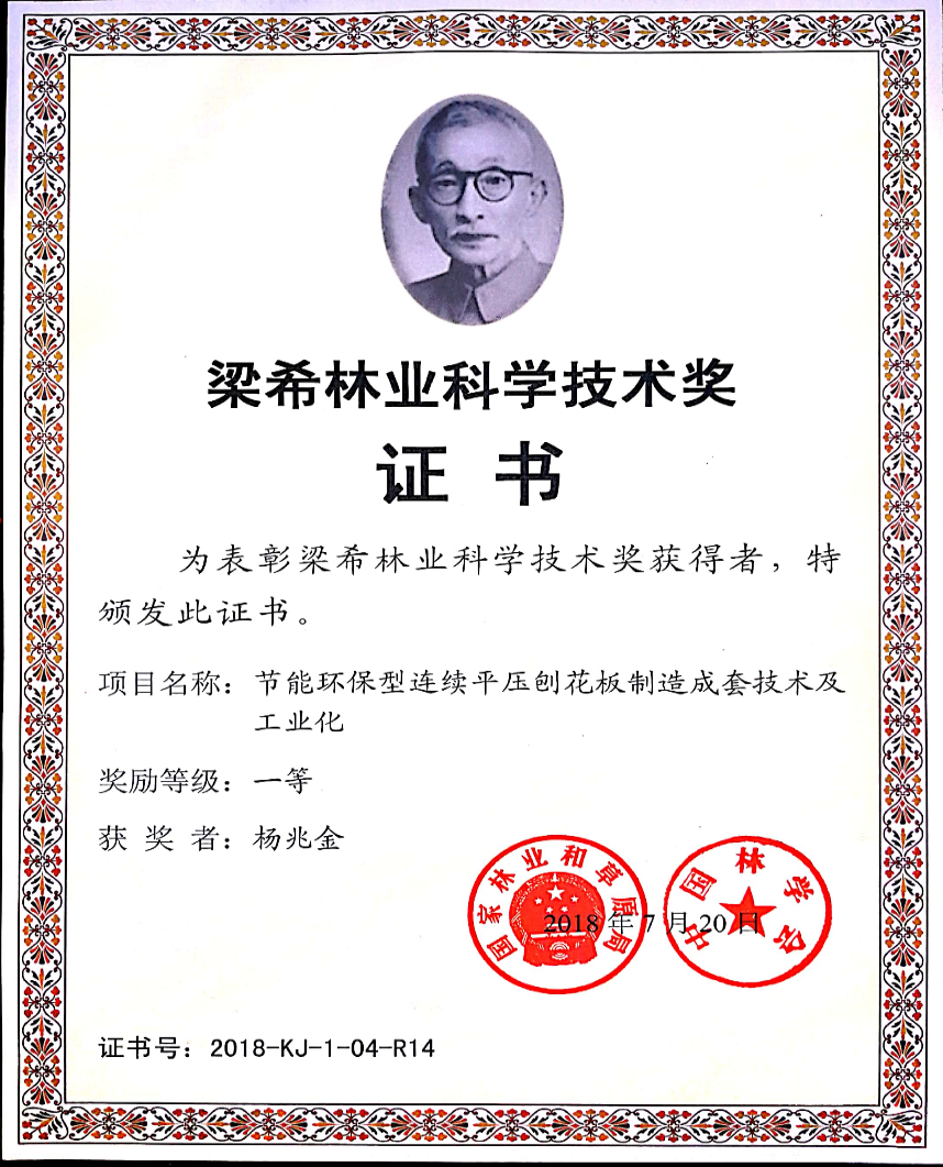 杨兆金,中共党员,现任飞林人造板集团公司技术总监,主要负责公司的新产品研发和技术改进工作。林产工业学院木材加工1996届毕业生,在校期间是学院中长跑运动员,曾在学校运动会上取得过5000米竞走第一名、3000米障碍跑第二名的成绩,至今还存着学院发的运动背心做纪念。2018年公司配合西南林大申报的“节能环保型连续平压刨花板制造成套技术及工业化”项目获得梁希林业科学技术一等奖,是获奖人之一。