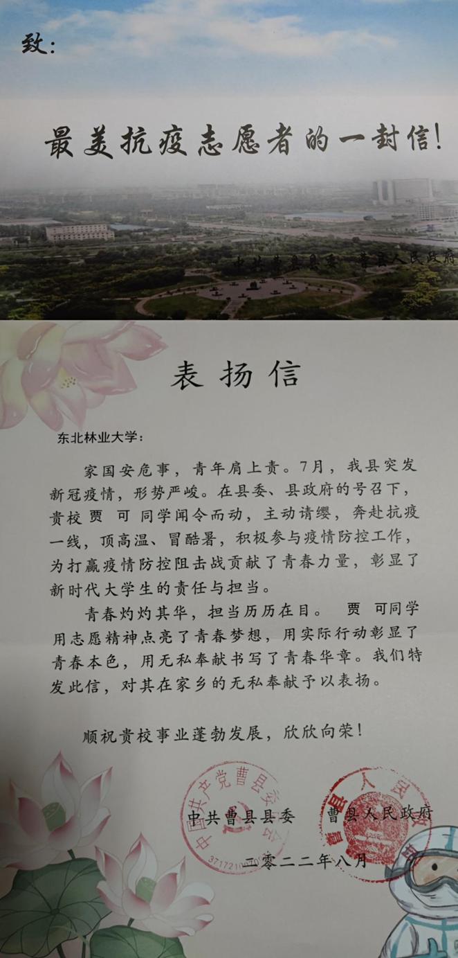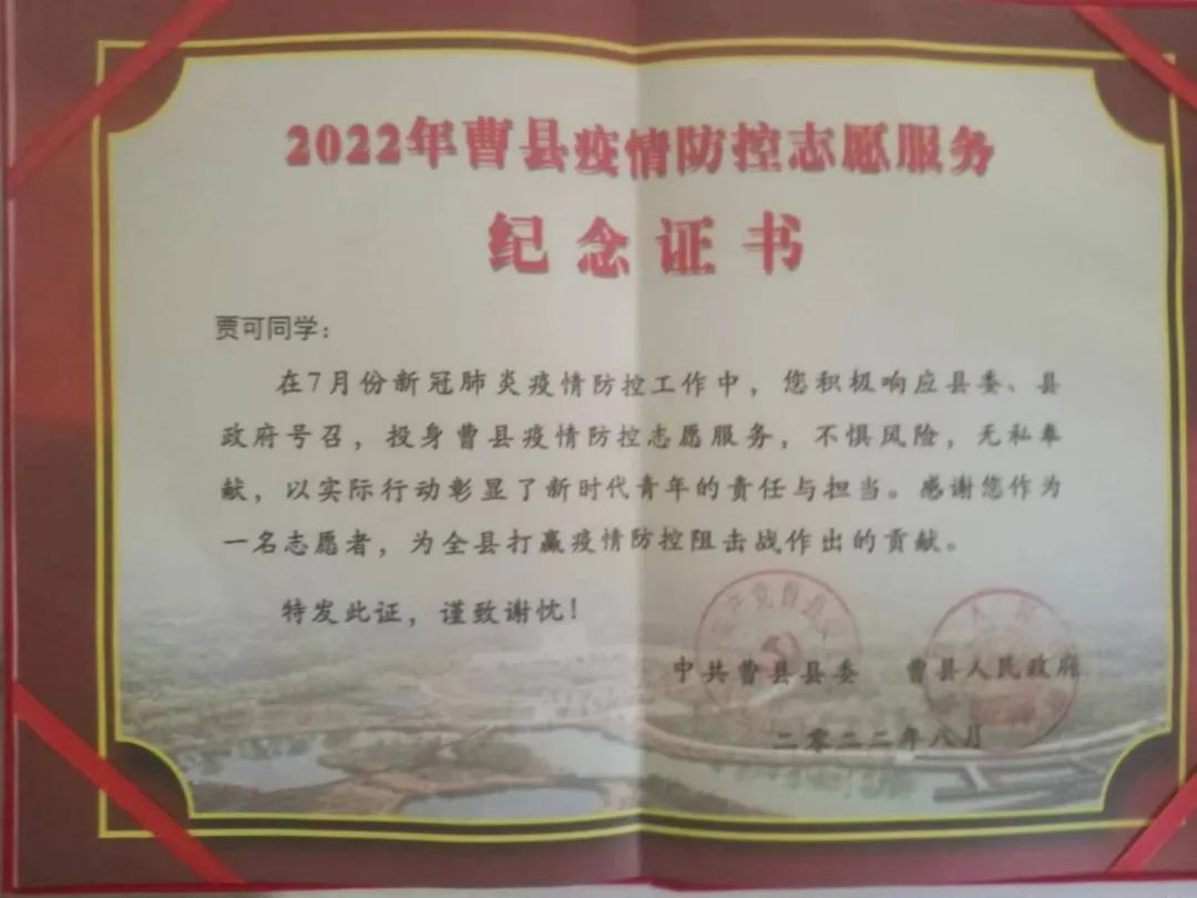 “疫字当头,义不容辞”,尽微薄之力,不负青春,不留遗憾。99499www威尼斯2022级艺术设计专业贾可同学,在家乡疫情爆发的情况下,作为一名东林学子,她谨记母校和师长的谆谆教导,谨记东林人的责任与担当。在县政府和镇政府的共同号召下,主动报名加入志愿者队伍,投身抗疫前线,为家乡疫情防控工作筑牢坚实堡垒。一份荣誉,一份担当,抗疫期间,贾可同学任劳任怨、无私奉献、恪尽职守的精神感染着周围的人们,凸显出特殊时期“东林精神”的时代内涵,贾可同学抗疫期间的付出获得了县政府的充分认可,并收到了来自县政府颁发的志愿者证书和感谢信。