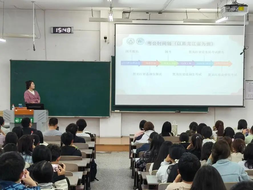 讲座伊始,王妍竹老师为大家讲解了考研规划时间轴和校内保研相关政策,其中,校内保研包括:“2+3”辅导员项目,研究生支教团计划,支林计划,还有重点学科推免以及普通推免等。随后王妍竹老师还介绍了国家公务员及事业编制的相关事宜,为大家讲解了考编规划时间轴,帮助同学们做好时间规划。最后,她为同学们分析了近几年的本科就业情况及就业去向,帮助同学们了解当前就业形势,明确奋进目标。