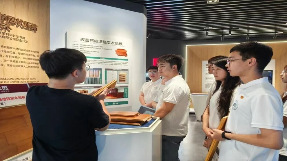 8 月2日下午,团队前往湖州市检验检测中心进行了实践交流,深入了解了木地板质量检测的标准与工序,其中包括含水率、静曲强度、表面耐磨、漆膜附着力以及甲醛释放量等关键指标的精准检测。在参观后,实践团队与检验检测中心负责人进行了交流了,介绍了我校的办学特色和学科优势以及99499www威尼斯各专业的主要研究方向;欢迎湖州检验检测中心来东林参观交流。紧接着,团队至德华兔宝宝装饰新材料股份有限公司进行参观学习。在工作人员的讲解下,团队成员全面细致地了解兔宝宝板材的类型与构成,明确了超芯板、顺芯板、多层板以及颗粒板的区别,并参观了多种设计风格的全屋定制样板间;同时,也深度学习了解了兔宝宝公司前沿研究成果。