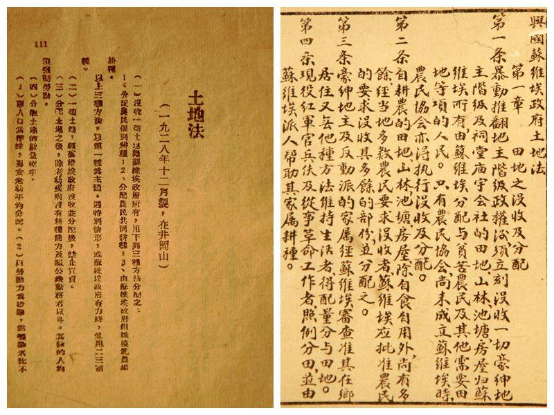 1928年10月,在湘赣边界,党的第二次代表大会认真总结了井冈山近一年的土地革命的实践,起草了《井冈山土地法》。《井冈山土地法》经过两个月的讨论、多次补充修改, 12月由湘赣边界工农兵苏维埃政府正式颁布,这是土地革命战争时期我党制定的第一个土地大纲。《井冈山土地法》解决了土地的没收与分配、山林的分配和竹木的经销、土地税的征收和使用等问题。但因受当时“左”倾思想的影响,这部土地法也存在一些缺陷:一是没收一切土地而不是没收公共的土地和地主土地进行分配;二是土地所有权属政府而不是属农民自己,农民只有使用权;三是禁止土地买卖。