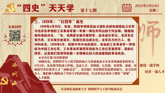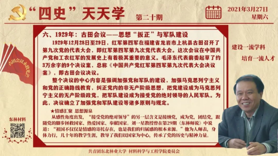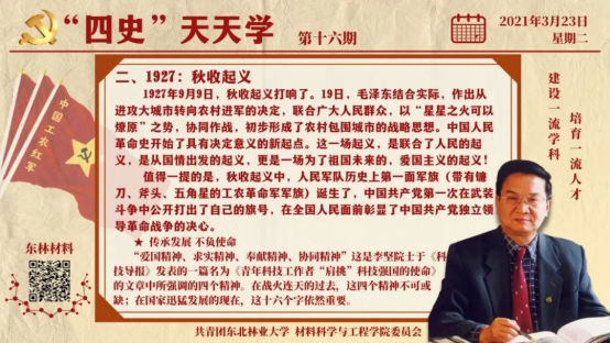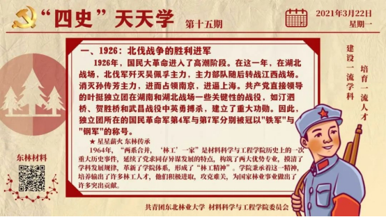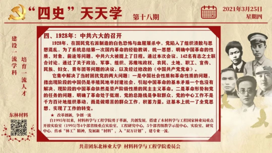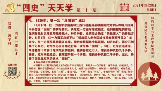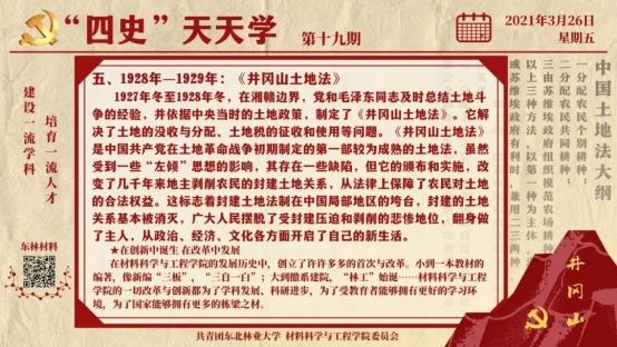 本次“四史学习周”于3月21日开展至今日圆满结束。在本次四史学习周中,我们学习了艰辛曲折的北伐战争,感受到爱国将士团结一致、奋勇杀敌的英雄气概;学习了我党领导农民翻身求解放、探索革命新道路的伟大实践——秋收起义,领会到我党独立领导革命战争的决心;学习了“红四军”的优良革命传统,对红军坚决执行的信心和决心有了更深刻的理解;学习了中共六大的理论知识,感悟到我党筚路蓝缕的初心;学习了我党领导农民实行土地改革的第一次尝试——井冈山土地革命,了解我党在土地改革工作中的伟大实践过程;学习了古田会议的相关知识,学习我党的根本组织原则——民主集中制;学习了革命先辈在敌众我寡的情况下实行反围剿行动的壮举。