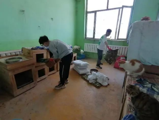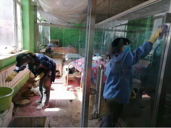 进入站内,在基地负责人的带领下,志愿者们开始忙活起来。当天的任务是整理猫舍,包含清洗玻璃、为小猫咪们更换床单和清扫地面等等。
