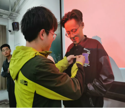 公布名单之后,两位老团员为新团员们颁发了共青团团徽,并为新团员代表佩戴团徽。