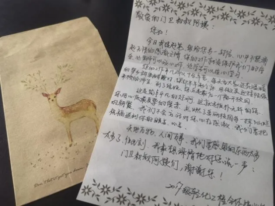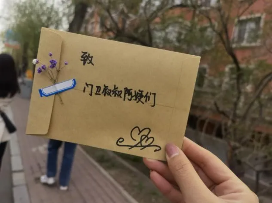 人往往习惯于周围人的无私付出,正因如此,常常会忽视身边的人。疫情以来,进出校门刷卡通行成为了所有在校生和老师的习惯。无论严寒酷暑,狂风暴雪,都有那样一群人,日夜轮班,坚守岗位,他们就是门卫叔叔阿姨。平凡的岗位,不平凡的责任,他们观察进出动态,保卫校园安全,他们守住的是外来人员乱入的行为,守住的是在校学生和老师的家园,更守住的是一份信任与责任。我们13B#641寝室为门卫叔叔阿姨送去矿泉水、纸巾、口罩,还有一封手写信。叔叔阿姨给予我们最衷心的毕业祝福。纸短情长,祝愿门卫叔叔阿姨们永远开心快乐健康。多年陪伴,无怨无悔,心怀感动,谢谢你们。
