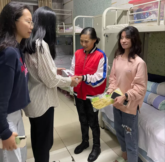 我们拜访了宿舍楼保洁阿姨,开门后,保洁阿姨非常热情的邀请我们进入了她的宿舍,阿姨的宿舍十分干净整洁,东西摆放的都很整齐,我们将准备好的礼物赠送给了阿姨,希望阿姨在工作的同时也能注重自己的身体。保洁阿姨是宿舍楼的美容师,她们“宁为一人脏,换来万人洁”,感谢她为我们宿舍楼的环境卫生整洁做出的贡献。