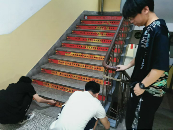 为庆祝我党一百周年华诞,创意宿舍楼布置,丰富宿舍楼文化,围绕“我为师生办实事”理念,牢牢把握“办实事”这个落脚点,用高质量的服务回馈师生期盼,材料院学生会生活部在5月31日带领大家贴起了楼梯贴。这次活动共有十九名同学参与,其中设计小组三人,行动小组十六人,设计、订购、粘贴历时二十天,涉及12A八层楼的近百级台阶。通过此次活动,同学们更加团结一致,党史学习教育也更有新意、更接地气。