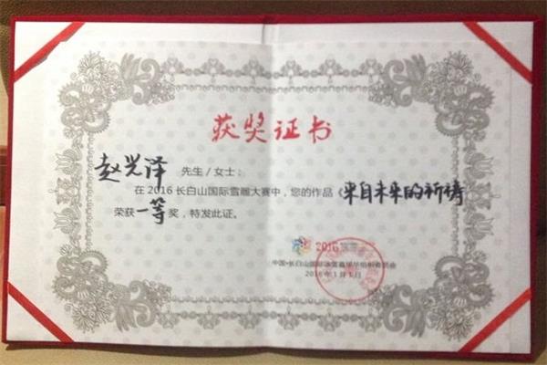 赵光泽老师在国际雪雕大赛中一举夺魁,其作品更是得到了极高评价。国际冰雪协会主席尤哈尼·林德伯格先生评价他的作品《来自未来的祈祷》“主题创意鲜明,思想性、文化性强,雕刻技艺精湛,空间形体处理丰富,艺术效果突出,堪称世界最高水平的艺术大作,提升了世界雪雕比赛水平,无愧于中国最好的雕塑家之一”。全国城市雕塑家协会主席殷小烽点评说:“作品《国色天香》体现了中国文化的传承,技巧精湛,难度指数超越了雪雕技术极限,空间层次影像高级,专业性强”。全国城市指导委员会艺委会副主席度景商民先生则认为“作品有东方元素的特征和美感,有当代雕塑特征。体现了国学的精华与韵味,实现了雪的梦想,让这个冬天有了温度。”