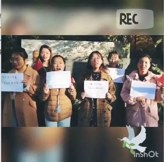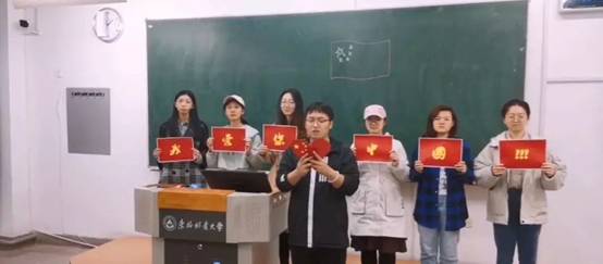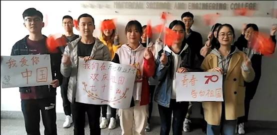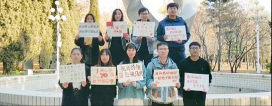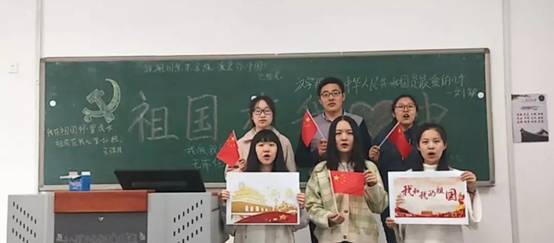 以“不忘初心告白祖国”为主题拍摄短视频,小组成员以手持卡片,内容:“我和我的祖国一刻也不能分离”“祝福祖国,平安昌盛生生不息”“祖国母亲,我要把美好的青春献给你”“我爱你中国”“用心爱国,以行报国”“祝我的祖国扬帆起航”“祖国祝你繁荣富强,千秋万代”“我以我心爱祖国,我以我行报祖国”等等,大声告白祖国!