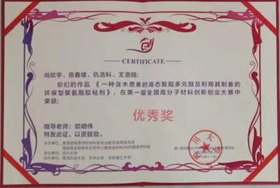 2019年11月24日下午,由四川大学承办,华南理工大学、东华大学、青岛科技大学协办的第一届“全国高分子材料创新创业大赛”(NPC大赛)决赛在成都四川大学望江校区圆满落下帷幕。我院高分子材料与工程专业“星月胶辉”代表队的参赛项目《一种含木质素的液态聚酯多元醇及利用其制备的环保型聚氨酯胶黏剂》最终在进入决赛的40支队伍中名列第22名,获得优秀奖。