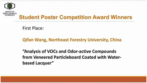 我院博士研究生王启繁在日前举行的第63届美国木材科学与技术学会(SWST 63rd)国际会议上获得学生海报竞赛一等奖,这是继去年第62届美国木材科学与技术学会(SWST 62nd)国际会议上我院硕士研究生曹田雨获得学生海报竞赛三等奖后获得的又一喜讯。