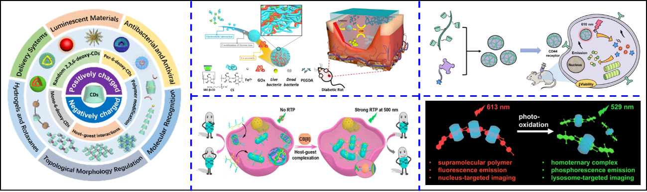 有机超分子化学在化学生物学、医药化学等领域有着极其重要的应用。多年来,我们课题组在多维超分子组装的构筑及其生物功能方面开展了一系列研究工作。在这里,我们综述了环糊精、葫芦脲等大环分子对不同客体分子的键合、包结模式;同时,还构筑了多种具有生物功能的有机超分子组装体,例如分子胶囊,纳米粒子,纳米管等纳米组装体,研究了它们在超分子催化、荧(磷)光能量传递、靶向细胞成像、药物递送以及癌症治疗等方面的应用性能。这对于超分子化学在生物科学领域的发展具有重要的科学意义,也为超分子化学在医学和材料科学等领域的进一步研究奠定了基础。