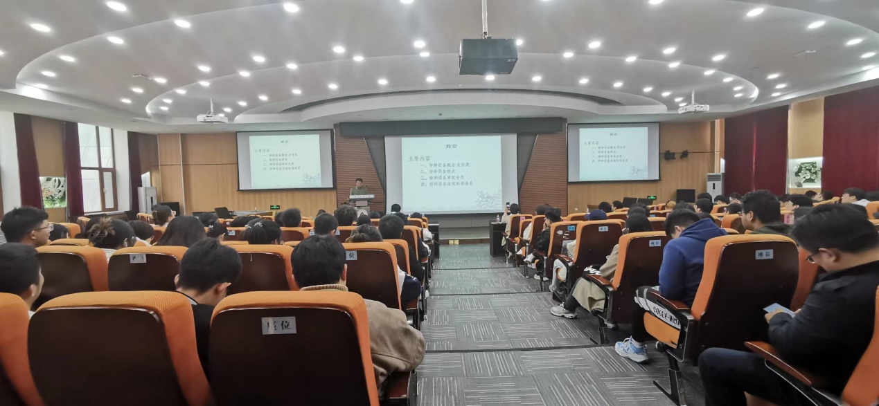 邢继春讲解了特种设备概念、分类、特点以及法规标准体系,详细介绍了压力容器由于密封、承压及介质等原因,容易发生爆炸、燃烧起火而危及人员、设备和财产的安全。同时,邢老师还对违规使用特种设备造成的安全事故进行逐一解析,通过真实而又残酷的案例,警醒现场师生要做到牢记特种设备理论知识和注意事项、落实特种设备安全管理办法、履行安全管理责任。最后他还强调,要对压力容器及其附件定期进行检验,操作和管理人员要持证上岗,并按操作规程使用仪器设备。