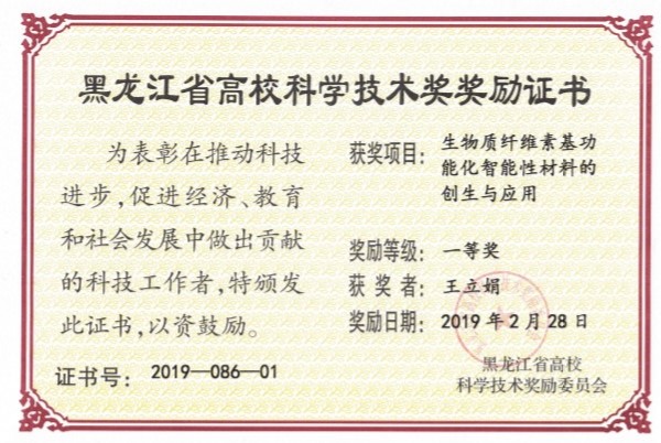黑龙江省高校科学技术奖一等奖(王立娟)
