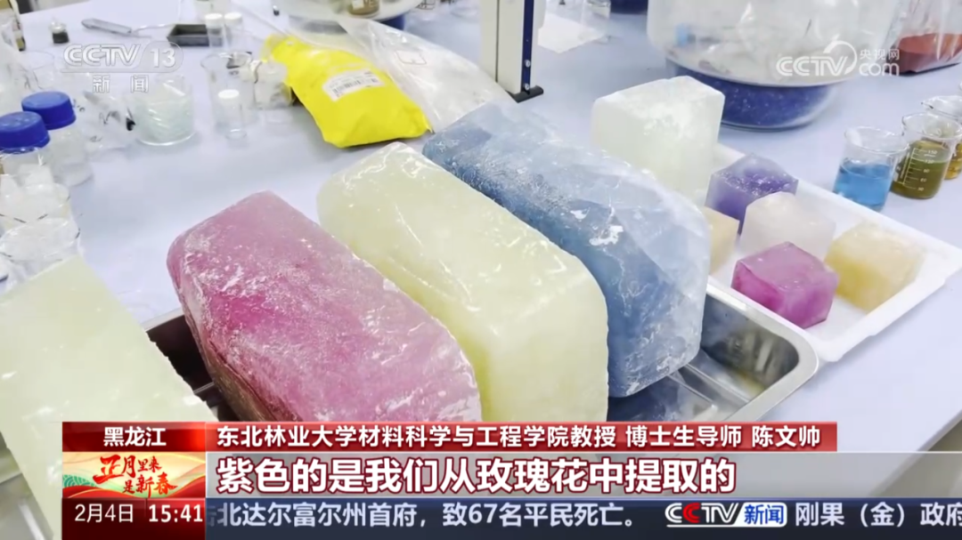 科技创新,赋能“绿色亚冬会”。在当前世界瞩目的哈尔滨,在冰雪大世界内的哈尔滨师范大学冰雪创意设计研学实践基地,出现了许多五颜六色的冰雕。这些冰雕色彩柔和,而且不会掉色。或许大家会以为,这是用传统工业色素或者丙烯颜料制成的彩冰,实际上,这些彩色冰雕是由哈尔滨师范大学和东北林业大学的科研团队首次利用植物中提取的天然色素创作而成的。