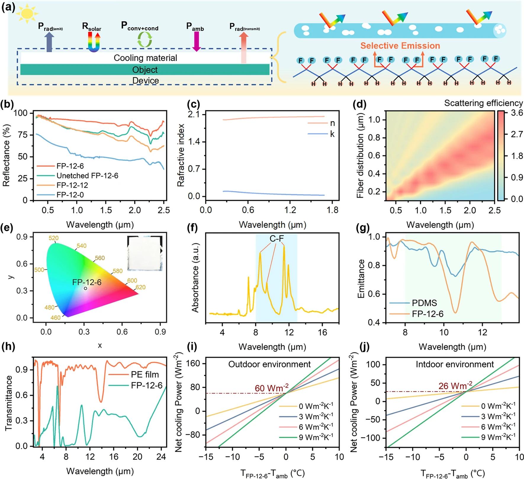 图4.太阳光反射和热辐射释放性能的表征。(a)辐射冷却机制示意图。(b) FP-12-6、未蚀刻的FP-12-6、FP-12-12和FP-12-0的太阳光反射光谱。(c) FP-12-6的折射系数和消光系数。(d) FP-12-6的FDTD模拟。模拟了0.2-1.2 µm的纤维尺寸分布。(e) FP-12-6的CIE色度图。插图是FP-12-6冷却织物的图像。(f) FP-12-6的FTIR光谱。(g) PDMS薄膜和FP-12-6的热辐射发射光谱。(h) PE薄膜和FP-12-6的热辐射透过光谱。(i, j) FP-12-6的理论室外和室内净冷却功率。