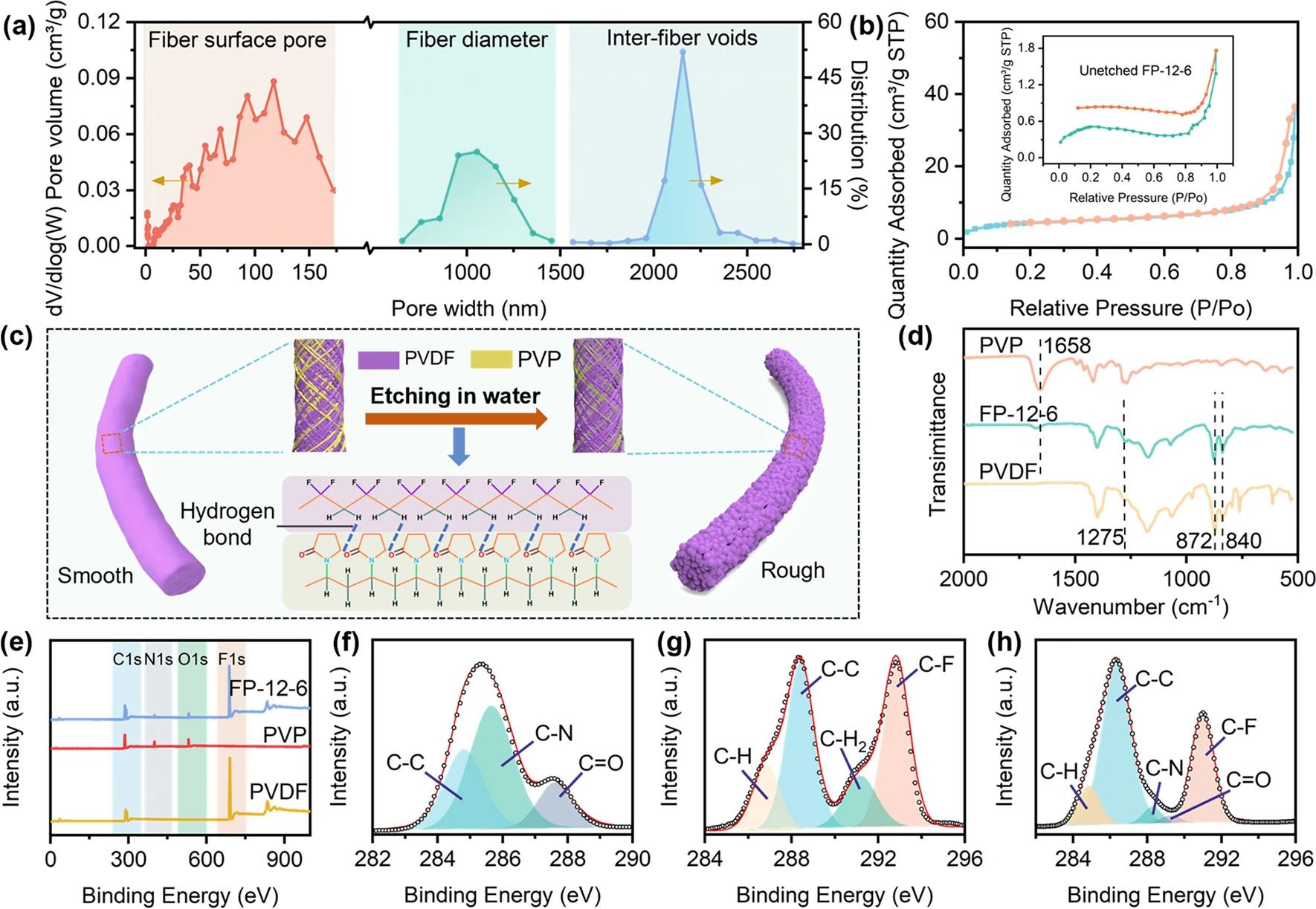 图3.冷却织物的尺寸分布及半互穿孔的形成机制。(a) FP-12-6的尺寸分布。(b)蚀刻前后FP-12-6的氮气吸附-脱附等温线。(c)半互穿孔的形成机制示意图。(d) FP-12-6的FTIR图像。(e-h) PVP、PVDF和FP-12-6的XPS图像。