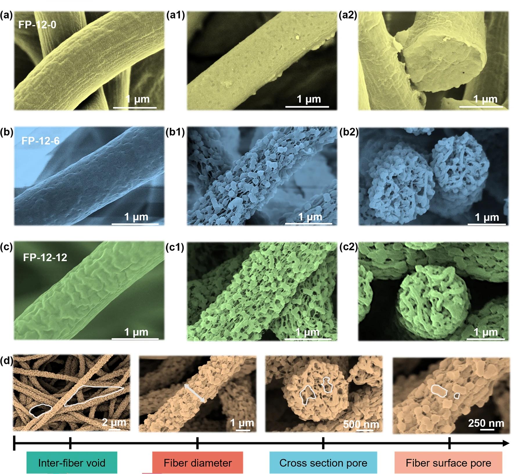 图2.不同比例织物的SEM图像。(a)未蚀刻的FP-12-0纤维。(a1, a2)蚀刻后的FP-12-0纤维及其截面形貌。(b)未蚀刻的FP-12-6纤维。(b1, b2)蚀刻后的FP-12-6纤维及其截面形貌。(c)未蚀刻的FP-12-12纤维。(c1, c2)蚀刻后的FP-12-12纤维及其截面形貌。(d) FP-12-6的全尺寸结构分布。