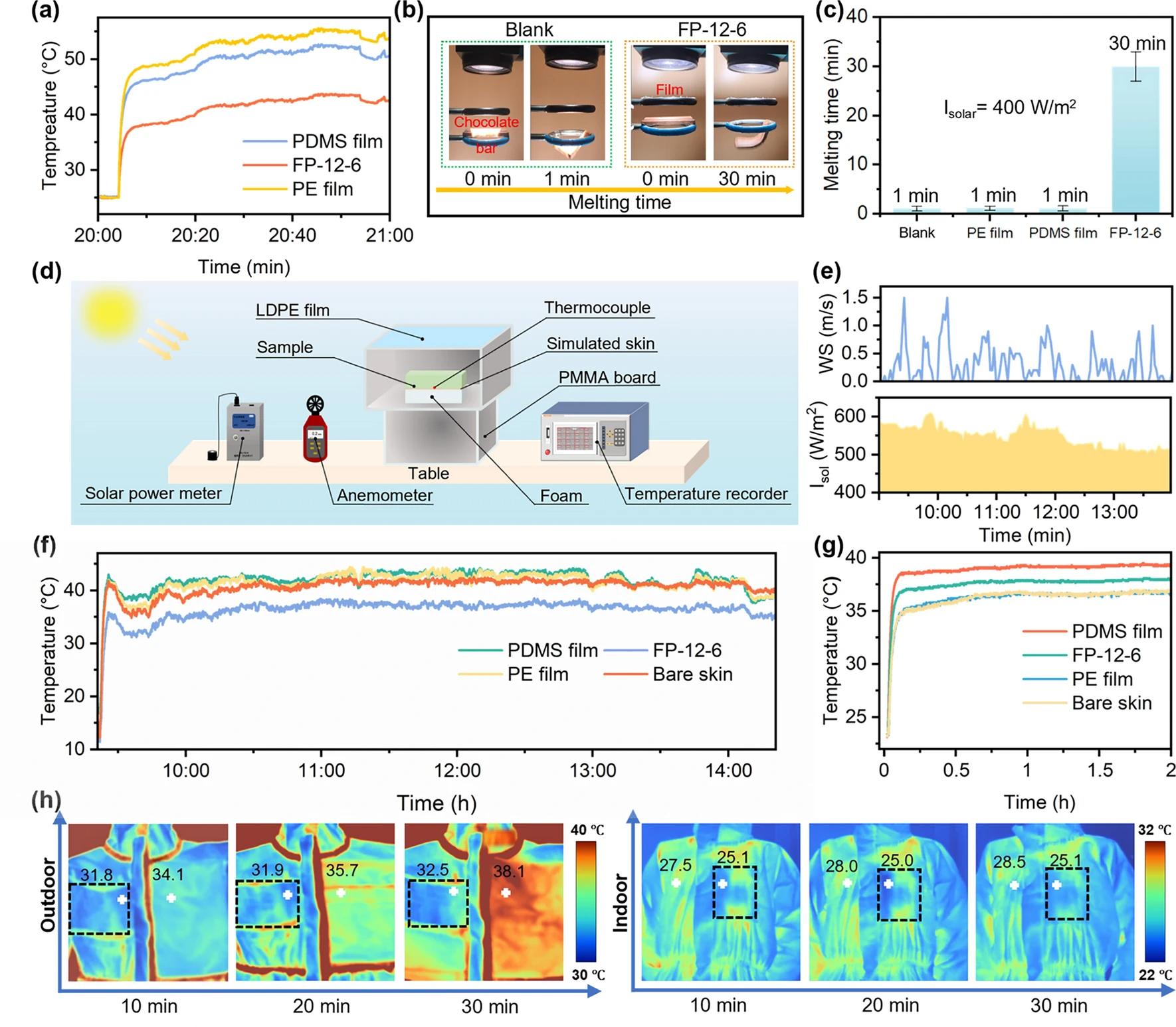 图5.实际辐射冷却性能。(a) FP-12-6、PE薄膜和PDMS薄膜的室内模拟太阳光测试。(b)巧克力融化实验示意图。(c)巧克力融化实验结果。(d)室外冷却测试装置示意图。(e)室外测试中风速和太阳光强度的测量。(f) FP-12-6、PE薄膜和PDMS薄膜的室外冷却测试。(g) FP-12-6、PE薄膜和PDMS薄膜的室内冷却测试。(h) FP-12-6粘贴在防护服上的室内外冷却红外图像。