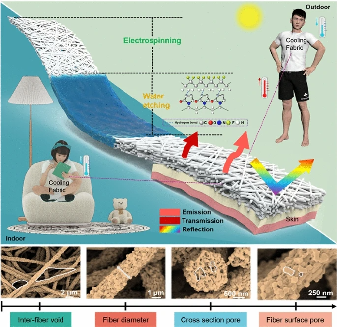 一般来讲,在减少热量输入(高阳光反射)的前提下,室内和室外冷却是通过调节透过/反射/发射热辐射来实现的。冷却织物的设计基于三个标准:i)利用全尺寸结构效应来满足高太阳光反射和低中红外辐射反射;ii)具有在大气窗口波段发射热辐射的官能团,以实现室外人体降温;iii)赋予材料在中红外波段的热辐射透过性能,以实现室内人体降温。