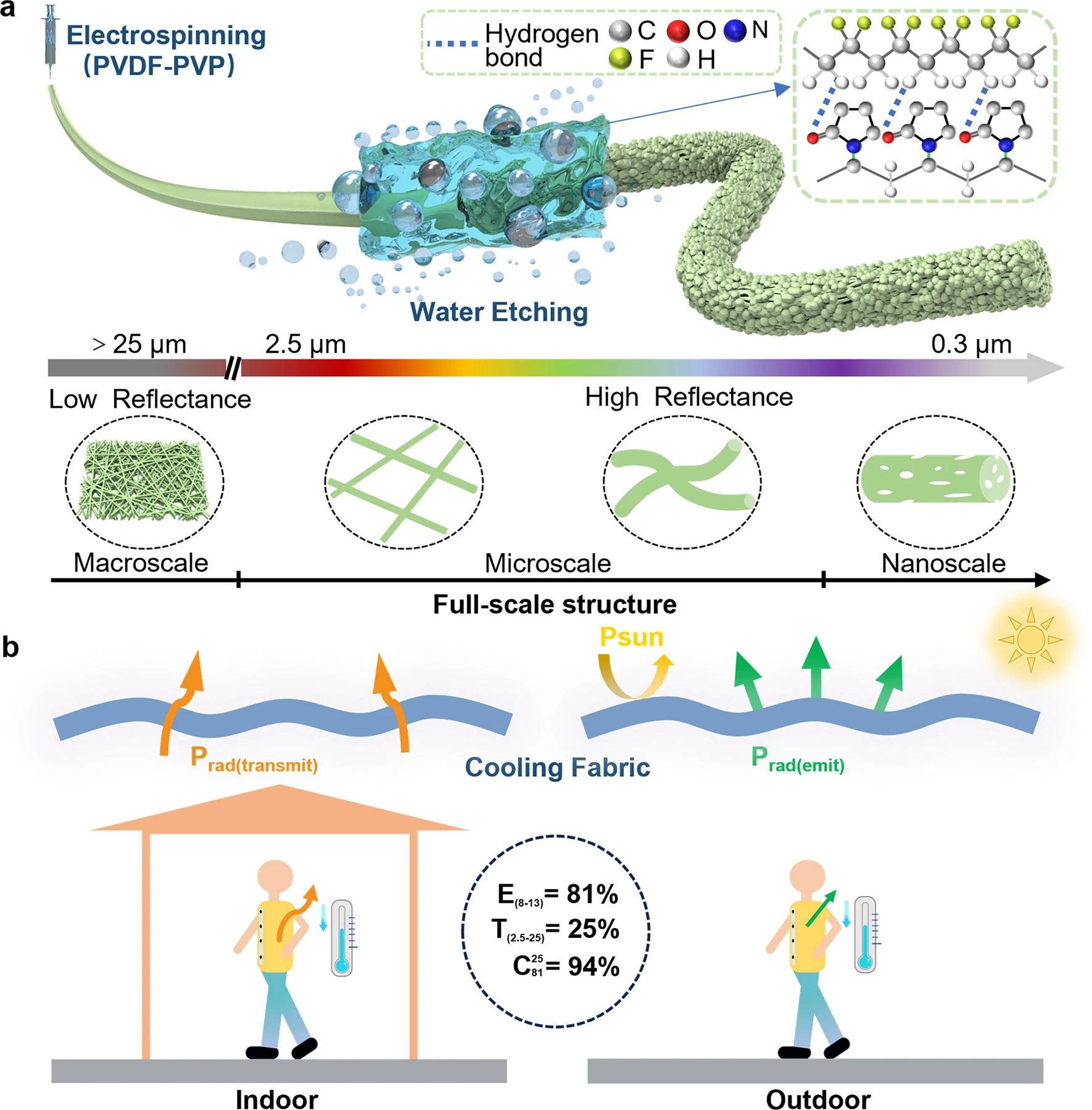 图1.冷却织物的设计与制备。(a)全尺寸结构冷却织物的设计。(b)室内外冷却示意图。