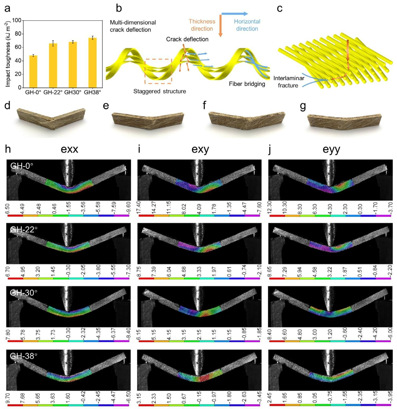 仿生GH复合材料的韧性和增韧机制:a) 冲击韧性。b) 通过GH结构的交错结构和纤维桥接效应协同构建多维裂纹偏转机制。c)Bouligand结构的层间骨折。d–g) (d)GH-0°、(e)GH-22°、(f)GH-30° 和 (g)GH-38° 的代表性损伤形态。h–j) 当撞击器位移为10 mm、(h)exx、(i)exy和 (j)eyy时,从落锤冲击试验中获得的应变 (%) 分布。